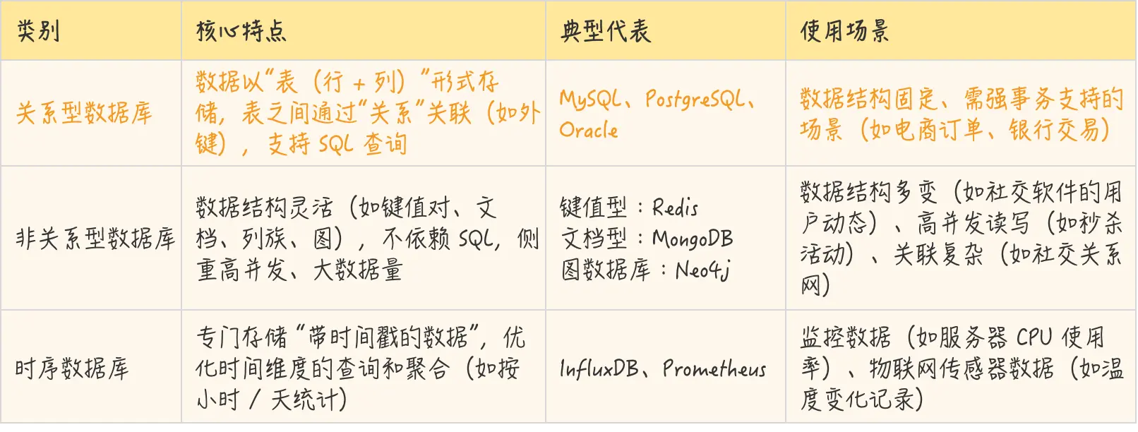 数据库的种类有:关系型数据库(RDBMS)、非关系型数据库(NoSQL)、图数据库、时序数据库、内存数据库、列存储数据库等等五花八门的类别,重点介绍下其中的3类: