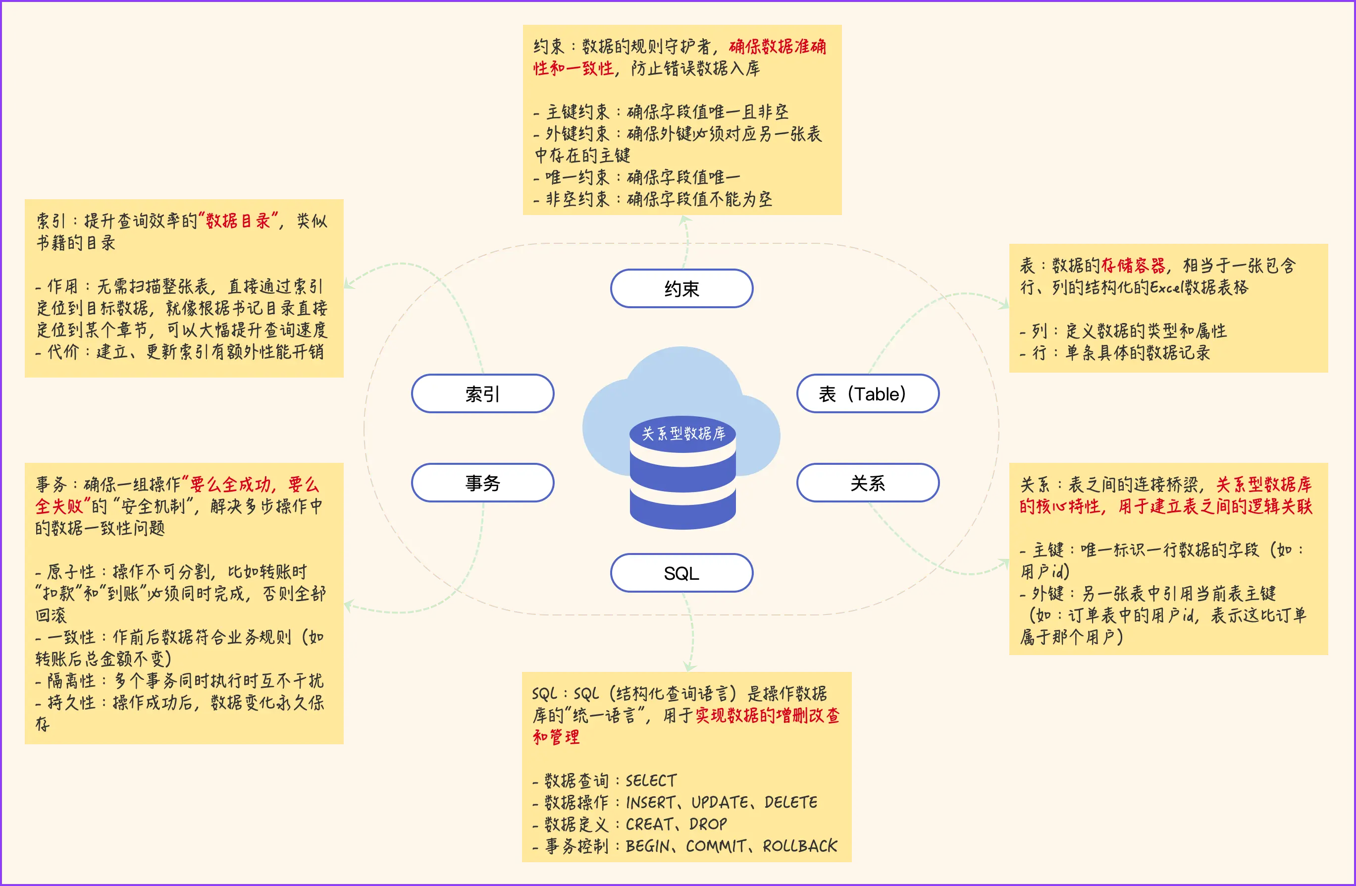 关系型数据库是采用二维表结构存储数据,通过主键与外键建立表间关联,用SQL操作数据,遵循ACID事务原则,确保数据完整性与一致性的数据库系统。