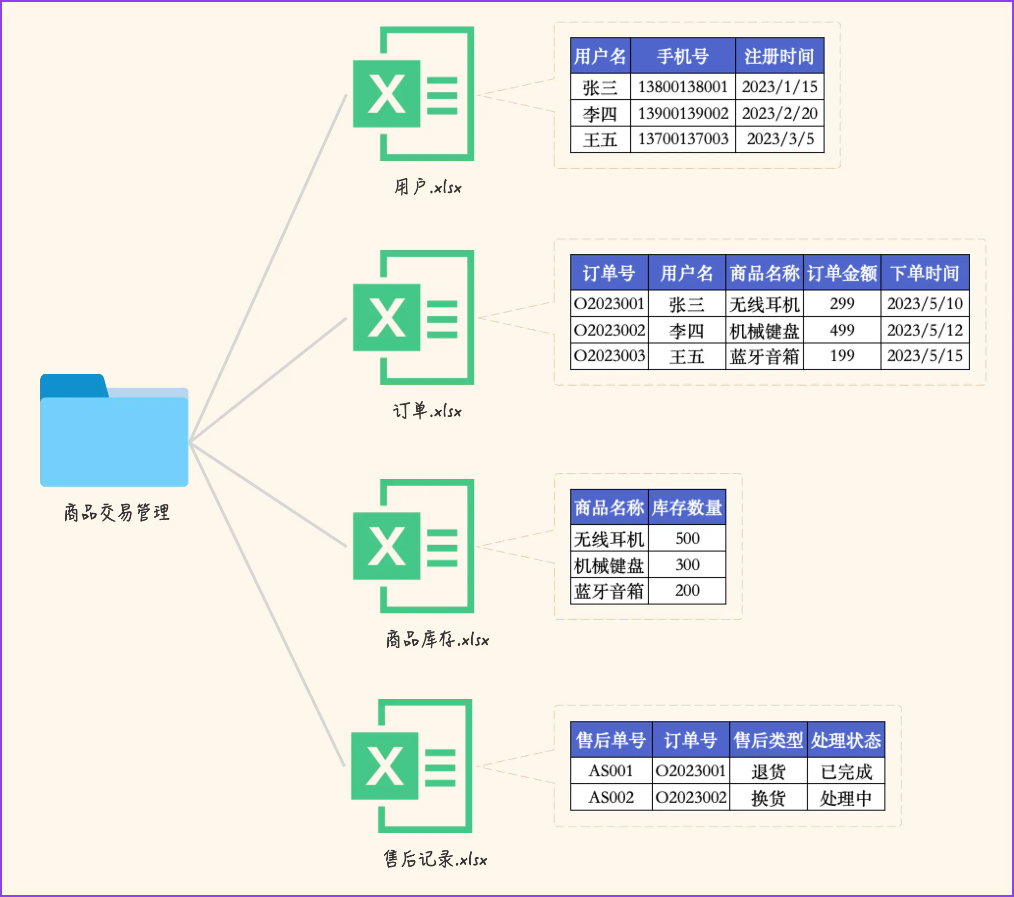 让我们穿越到互联网并不发达的古早年代,你那时候你还需要通过一张张Excel表格来管理自己丁点大的生意;你的电脑桌面上有这样一个文件夹:商品交易管理,里面有用户、订单、商品库存、售后记录4张Excel表格,全靠它们运筹于帷幄之中。