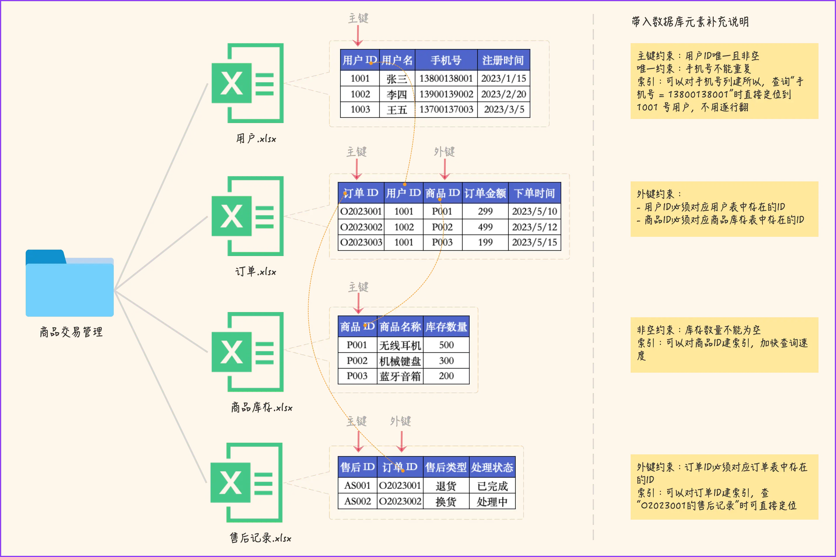 接下来,把上面讲解的关系型数据库的零件引入进来:文件夹 = 数据库,表 = Excel表,每张表首例的ID就是其主键、其余ID列为外键,最后补充上约束和索引添加规则就了然了