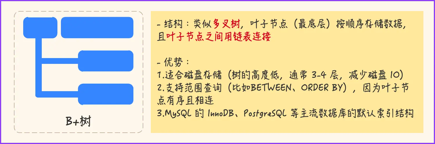不同数据库会根据场景选择不同的索引结构,最常见的有:B+树索引(最主流)、哈希索引、聚簇索引、全文索引这4种,咱们重点聊下B+树和哈希索引: