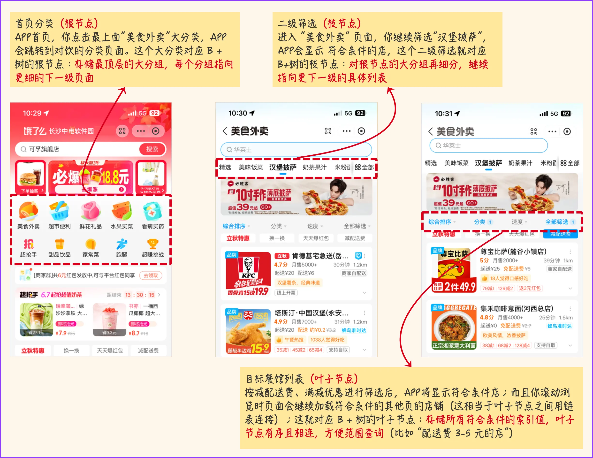 通俗解释,B+树其实就像外卖APP的「多级分类导航」!现在,请打开饿了么外卖APP,去找一家“减配送费且有满减优惠的披萨意面店”这个过程和B + 树查数据的逻辑几乎一样