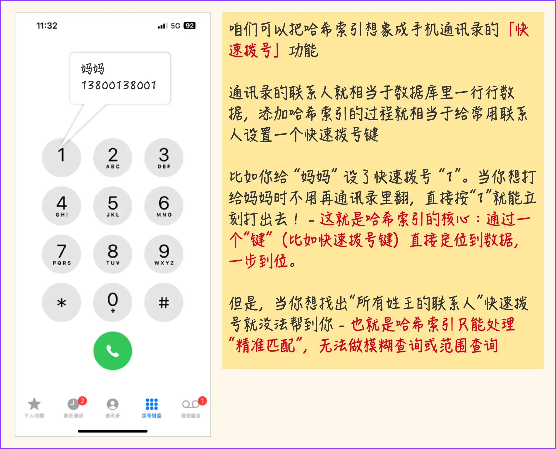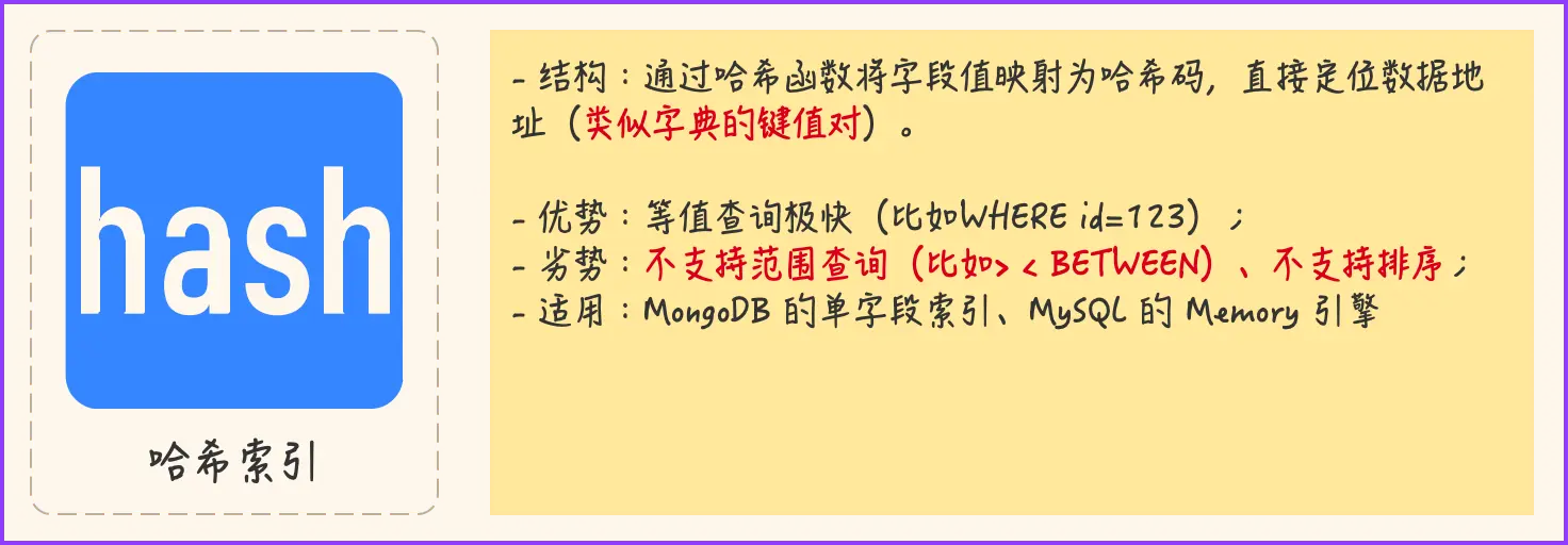 通俗解释,类比到数据库,比如给“用户ID”加哈希索引,当查询WHERE user_id = 123时,数据库会用哈希算法把“123”转换成一个「地址」,直接去这个地址拿数据,不用遍历整张表,指哪打哪!
