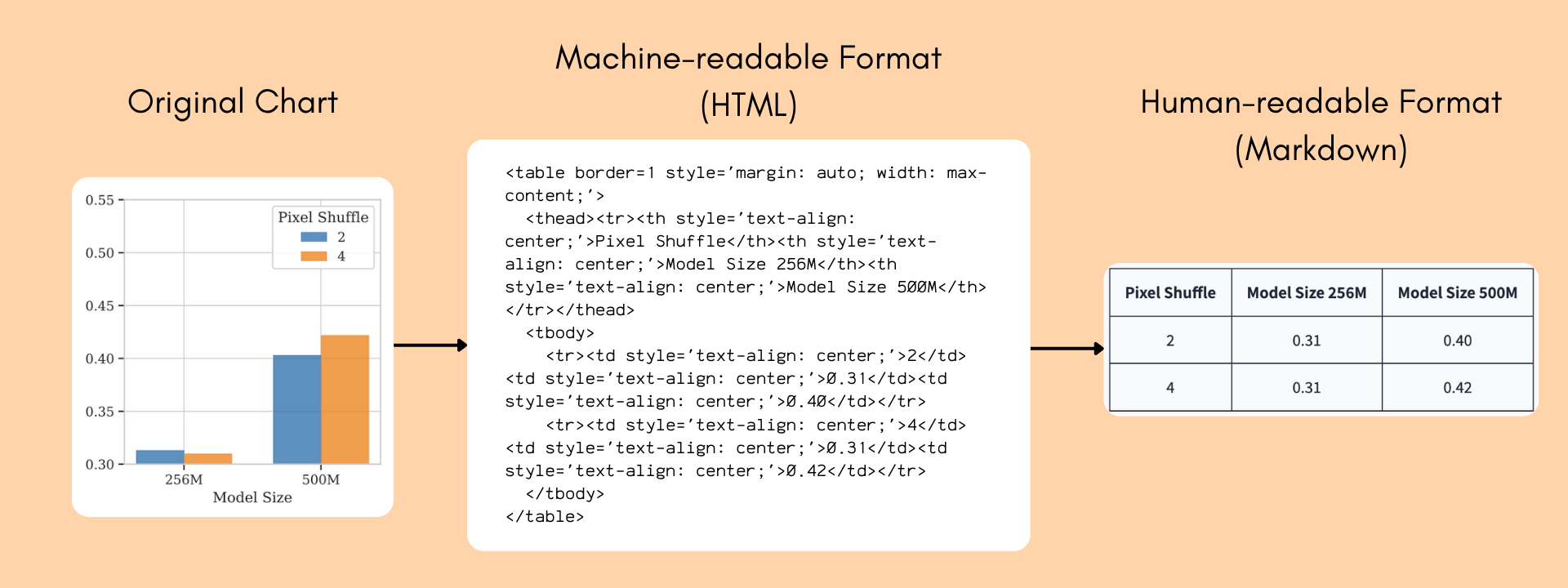 - 有些模型则会将其转换为可解析的结构化格式,如 Markdown 表格或 JSON。 例如,下图展示了一个柱状图如何被转换成机器可读的形式: