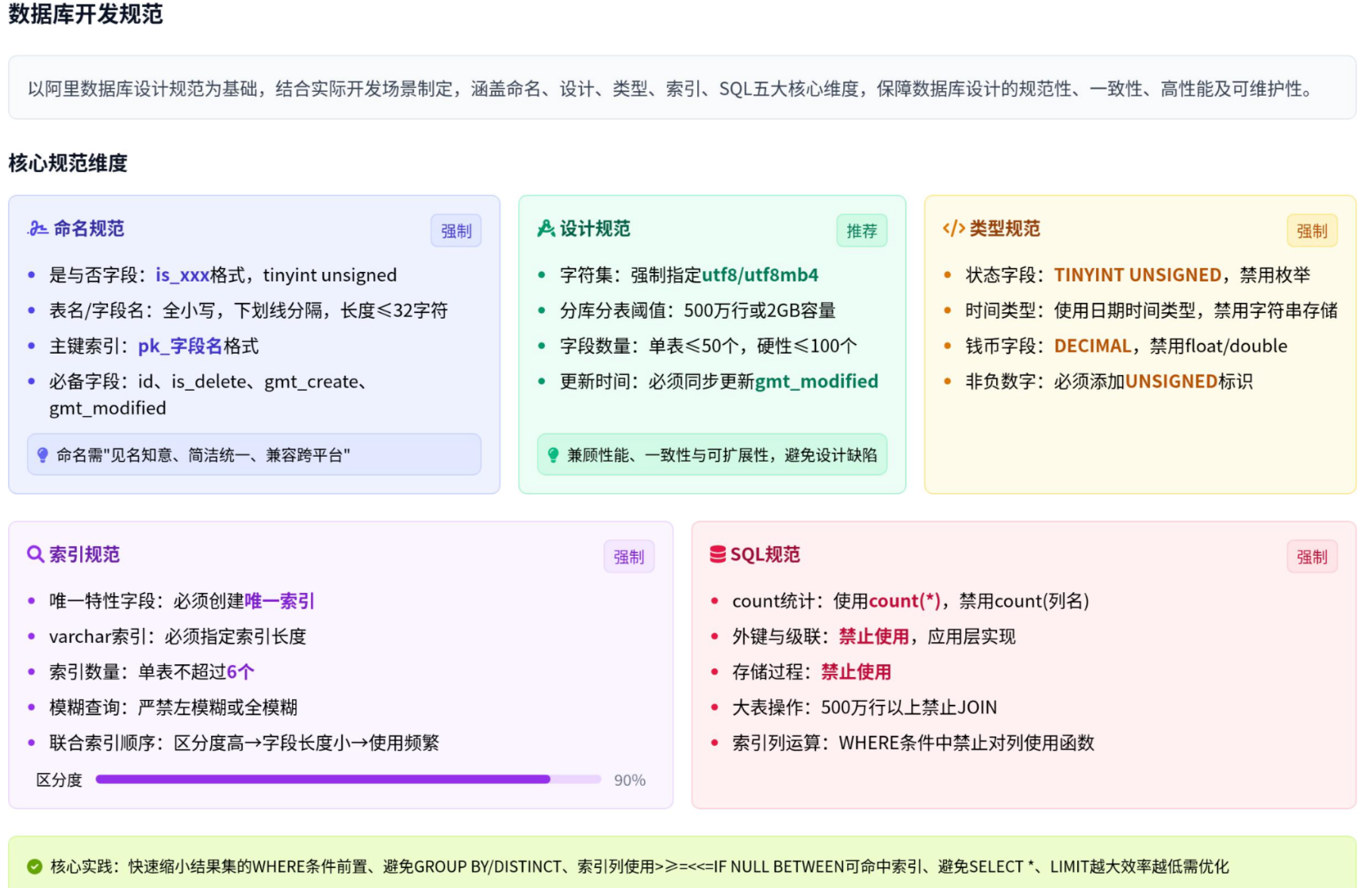 SQL编写需遵循性能优化、安全可靠的原则,明确各类SQL操作的禁忌与最佳实践,避免慢查询、数据异常等问题。