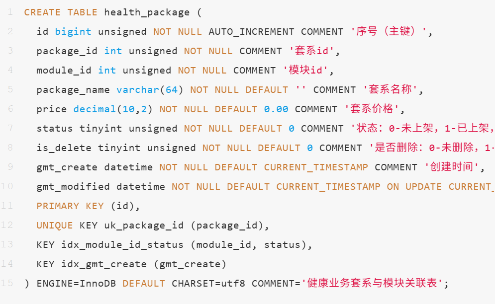 时间字段必备(建议):表必须包含gmt_create(创建时间)和gmt_modified(更新时间),便于问题排查。