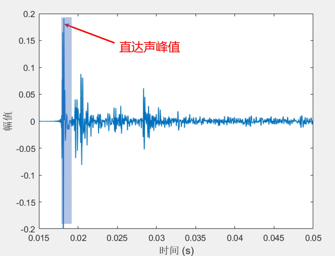 一个房间中的脉冲响应,红色箭头处代表直达声峰值,蓝色的框代表着直达声能量的计算范围。