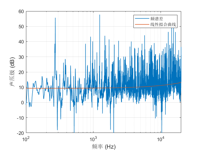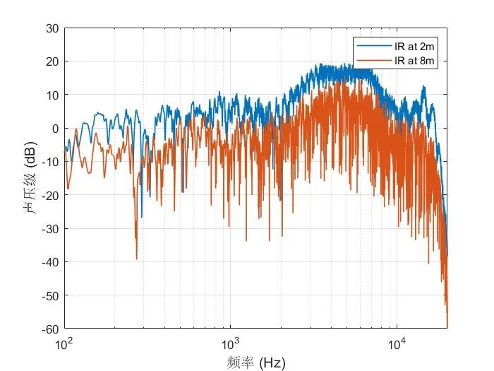 图a为相同角度测量得到的2米和8米处的房间脉冲响应的频谱,图b为2米与8米频谱相减得到的差值以及线性拟合曲线,可以看到随着频率的增加,频谱差略微增大。